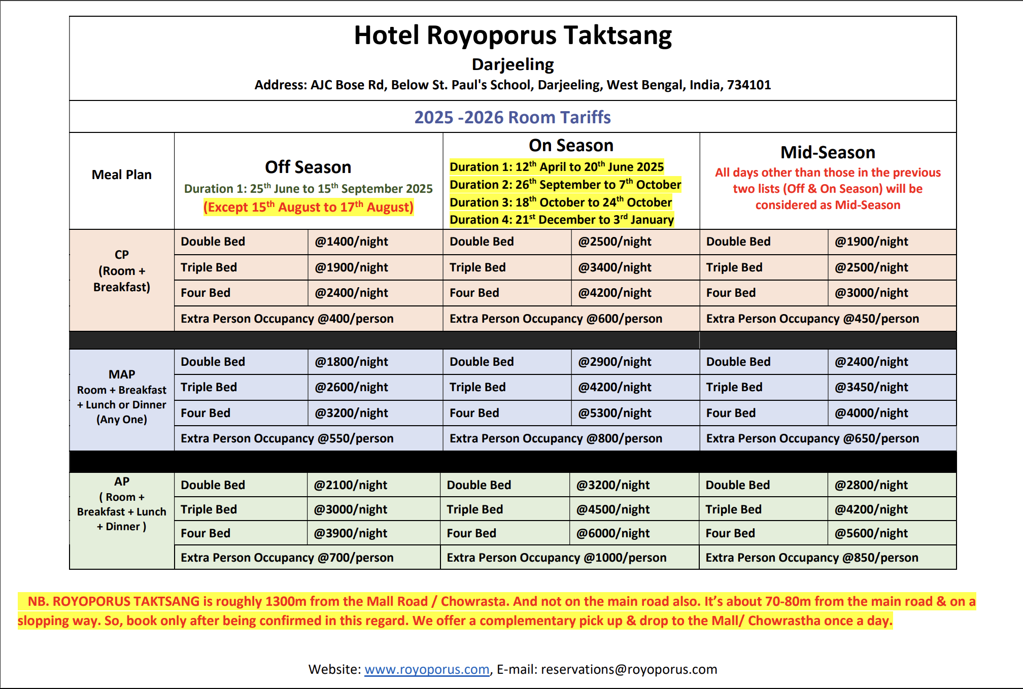 *All property details, tariffs, and facilities are subject to availability, seasonal variation, and may differ across properties. Kindly confirm current pricing, services, and availability directly via call or WhatsApp before finalizing your booking.